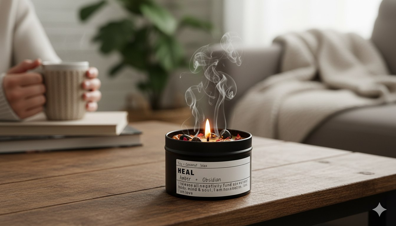 Unwind and rebalance with our "Heal" Crystal Infused Candle. Crafted with soothing Soy + Coconut Wax and adorned with powerful Amber and Obsidian crystals, this candle is designed to help you release negativity and embrace self-love. Let its warm glow and gentle fragrance create a tranquil sanctuary where you can nourish your body, mind, and soul.